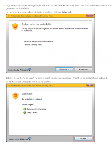 De installatie wordt uitgevoerd volgens de link die je opgaf tot op het moment dat men vraagt om de computer terug op te starten. Wanneer ik dit gedaan heb zou ik normaal gezien een telenet security pack icoon moeten krijgen maar dit is niet het geval. Enkel het bestand (20mb)op de harde schijf is te zien en dus geen icoon op het bureaublad. Ook wanneer ik alles terug deactiveer gebeurd er hetzelfde nadien. Vroeger stond er inderdaad nog een andere scanner op van Norton maar ook deze is volledig verwijderd. Voor de rest werkt de computer prima.