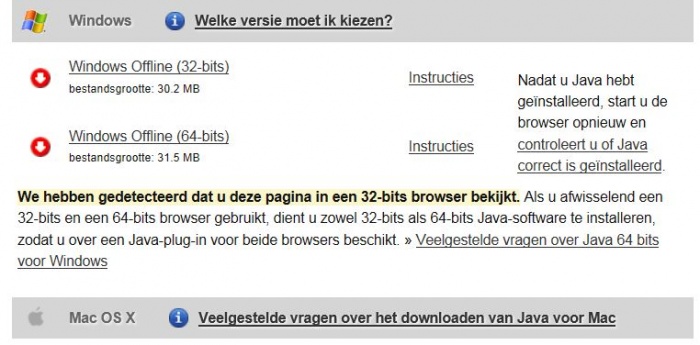 Ga via deze link naar de site van Java...ik lees dan (in IE10) volgende melding: We hebben gedetecteerd dat u deze pagina in een 32-bits browser bekijkt.