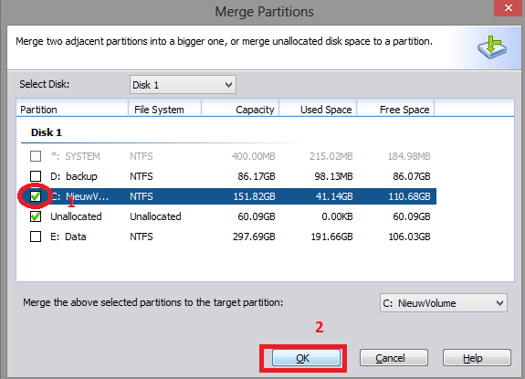 In het volgende scherm selecteer je partitie waar je de niet toegewezen ruimte aan wil toevoegen (1) en klik op Ok. (2)