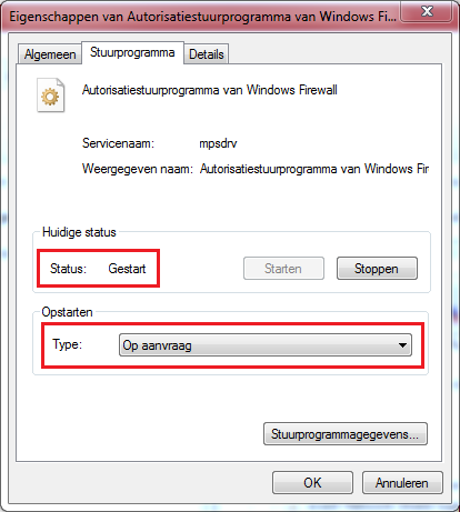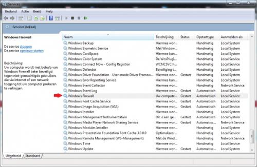 Navigeer naar Windows Firewall en kijk eens of deze services op Automatisch staat en gestart is.