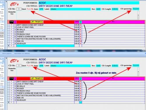 In het rapport 'CD-Fiches', links boven, werkt het dus heel eenvoudig. In het formulier 'CD's',rechts bovenaan, werkt het niet. Ik vermoed dat er een formule moet zijn met verwijzing naar telkens enkel de songs uit tabel 'CD-Tracks' die zijn gelinkt aan telkens de cd zelf, die telkens samentellen en delen door hun aantal (of gemiddelde) en x10 om in % te bekomen.