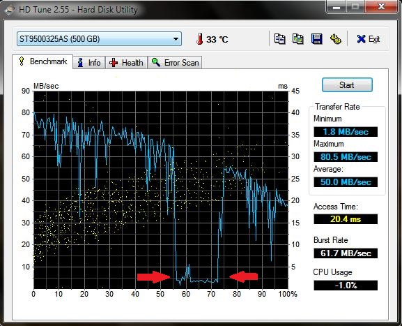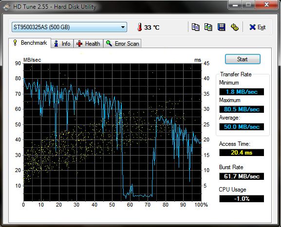 Zoals je ziet in de afbeelding die je gepost hebt zakt de snelheid van je HD helemaal weg en daar je pc bij het opstarten een schijfcontrole wilde doen beloofd dit niet veel goeds.