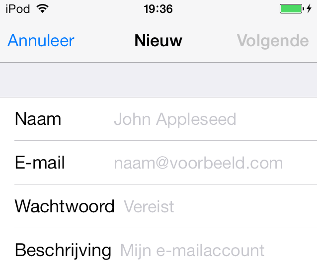 (iPhone) Instellingen >> E-mail, contacten, agenda’s >> Nieuw account >> Anders >> voeg account toe