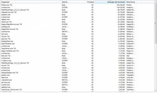 Klik nu op de hoofding van de kolom "geheugen" tot de processen die veel geheugen verbruiken bovenaan staan.
