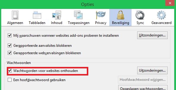 Nochtans hebben wij elk bij de opties/beveiliging van Firefox dezelfde schermen: met name nergens iets ingevuld ivm met gebruikersnaam of wachtwoorden.
