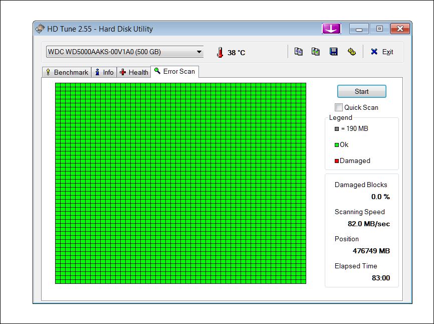 Vervolgens ga je naar het tabblad Error Scan, selecteer de harde schijf die je wil controleren en druk op Start (je dient GEEN vinkje te plaatsen bij Quick scan).