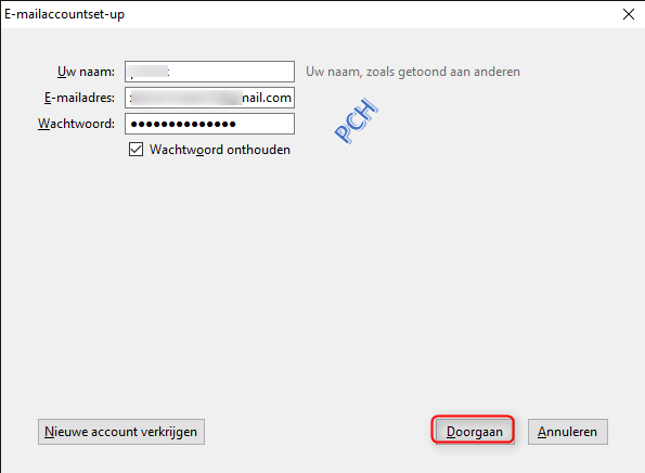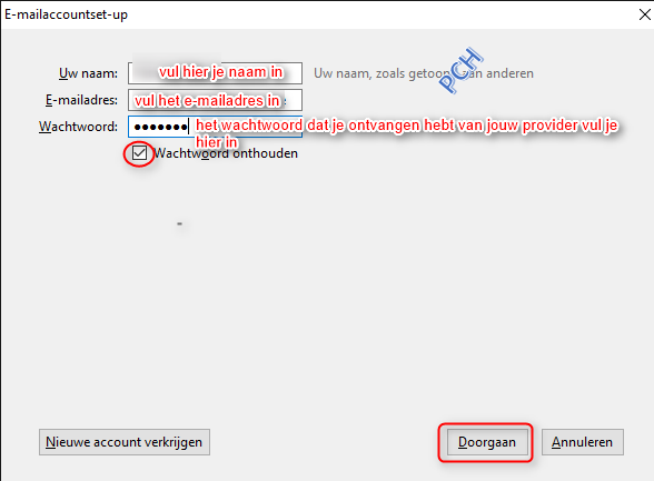In het volgend scherm geef je jouw naam, het e-mailadres en wachtwoord in dat je van jouw  provider ontvangen hebt. Zorg dat er een vinkje staat bij Wachtwoord onthouden.