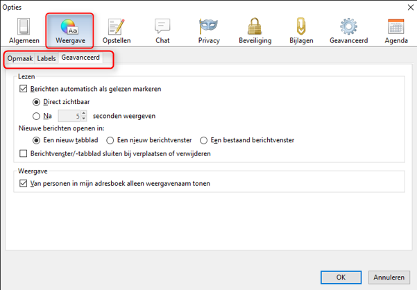 • Hoe nieuwe berichten geopend worden en als lezen gemarkeerd worden stel je in op het tabblad geavanceerd.