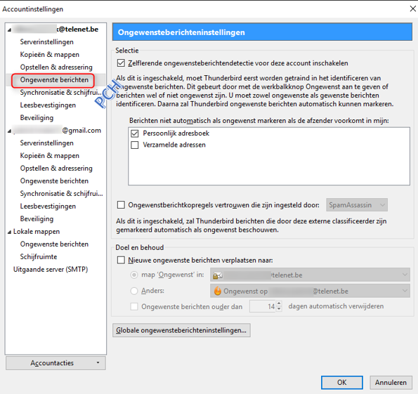 • Op het tabblad ongewenste berichten stel je de standaardinstellingen voor ongewenste berichtendetectie in.
