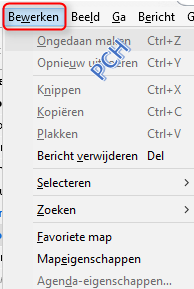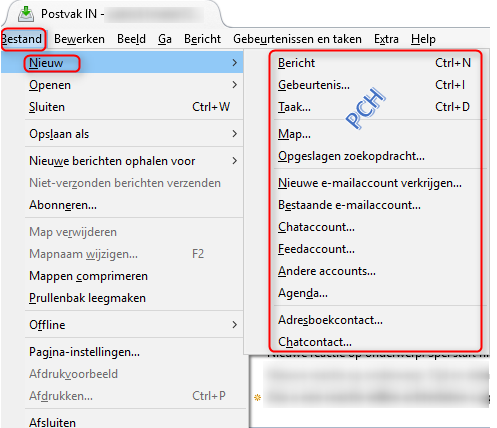 Een nieuw bericht, een gebeurtenis, een Taak, een nieuw account, of….. aanmaken doe je bijvoorbeeld via de opdracht Bestand-> Nieuw.