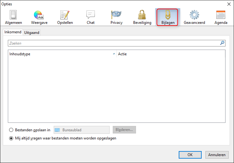 Instellingen voor bijlages bij inkomende of uitgaande berichten pas je aan op het tabblad Bijlagen.