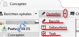 Klik je op het neerwaarts gericht pijltje achter Opstellen heb je nog de keuze tussen een nieuw bericht, een nieuwe gebeurtenis of een nieuwe taak.