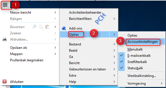 Via het menu Extra bereik je o.a. de Accountinstellingen, berichtenfilters, Opties…..