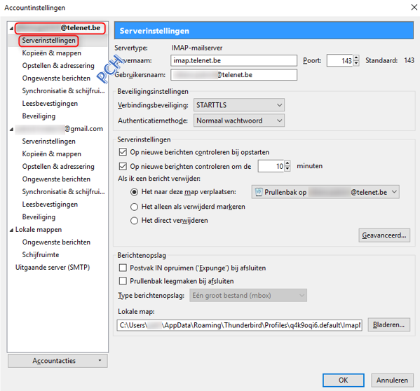 Je krijgt dan onderstaand scherm waar je in het rechterdeelvenster kan klikken op elk aangemaakt account en telkens naar Serverinstellingen, Kopieën & mappen, Opstellen & adressering Ongewenste berichten, Synchronisatie & schijfruimte, Leesbevestigingen, beveiliging en accountsacties kan gaan en de nodige instellingen aanpassen.