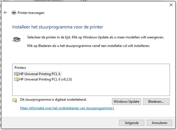2) Toen ik tijdens de installatie een printer moest selecteren, had ik twee keuzes (zie hieronder). Heb gekozen voor de bovenste optie.