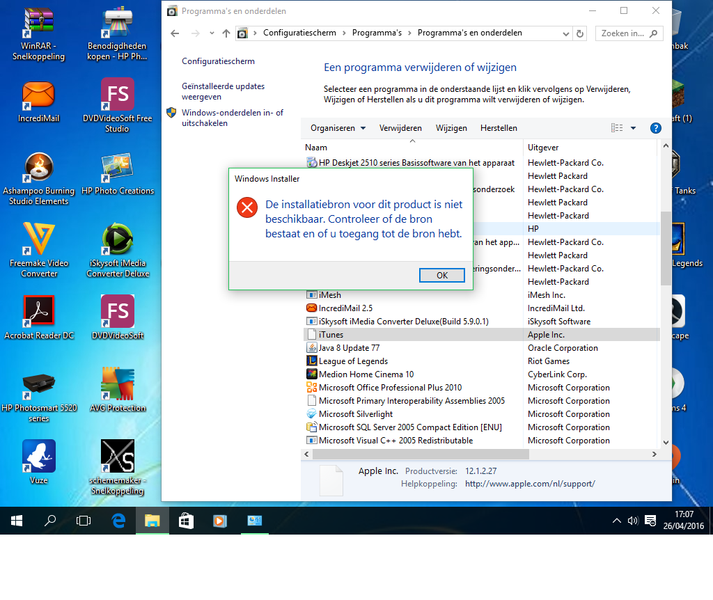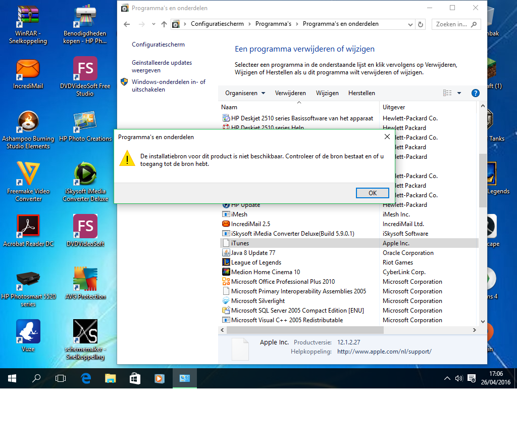 Helaas werkt dit niet op windows 10. Als ik het probeer te verwijderen, dan komt na herstart van de computer het apple product van iTunes er weer op. iTunes zelf krijg ik niet verwijdert of herstelt.