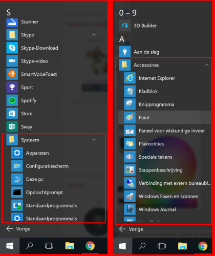 Ik vind de mappen Windows Accessories en Windows System toch nog terug, bij mij zijn deze Engelstalig. De snelkoppelingen hier onder werken allemaal.