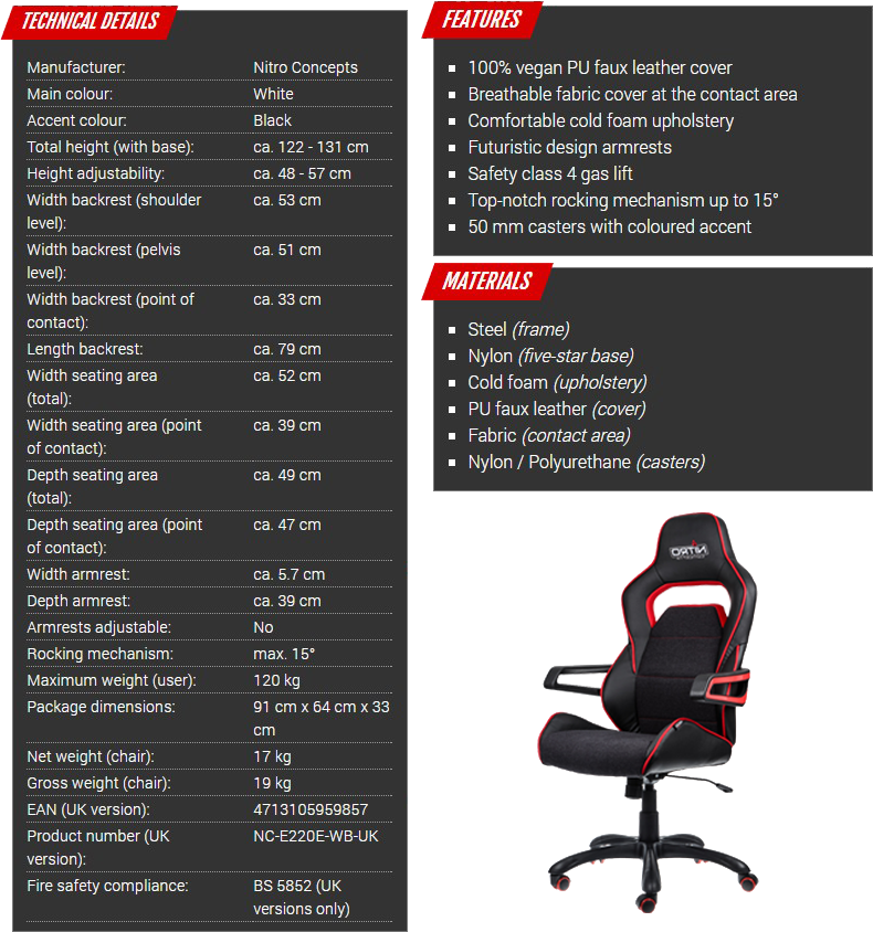 Om je even een overzicht te geven van de specificaties van een E220 Evo stoel, kijken we even naar de specificatielijst van Nitro Concepts zelf. Enkele belangrijke punten: het maximale gewicht van de gebruiker bedraagt 120 kg, de stoel zelf weegt zo’n 17 kg en de stoel is ergonomisch het best ingesteld voor personen met een maximale lengte van 185 cm. Grotere gebruikers kunnen bij Nitro Concepts terecht in eveneens grotere stoelen.
