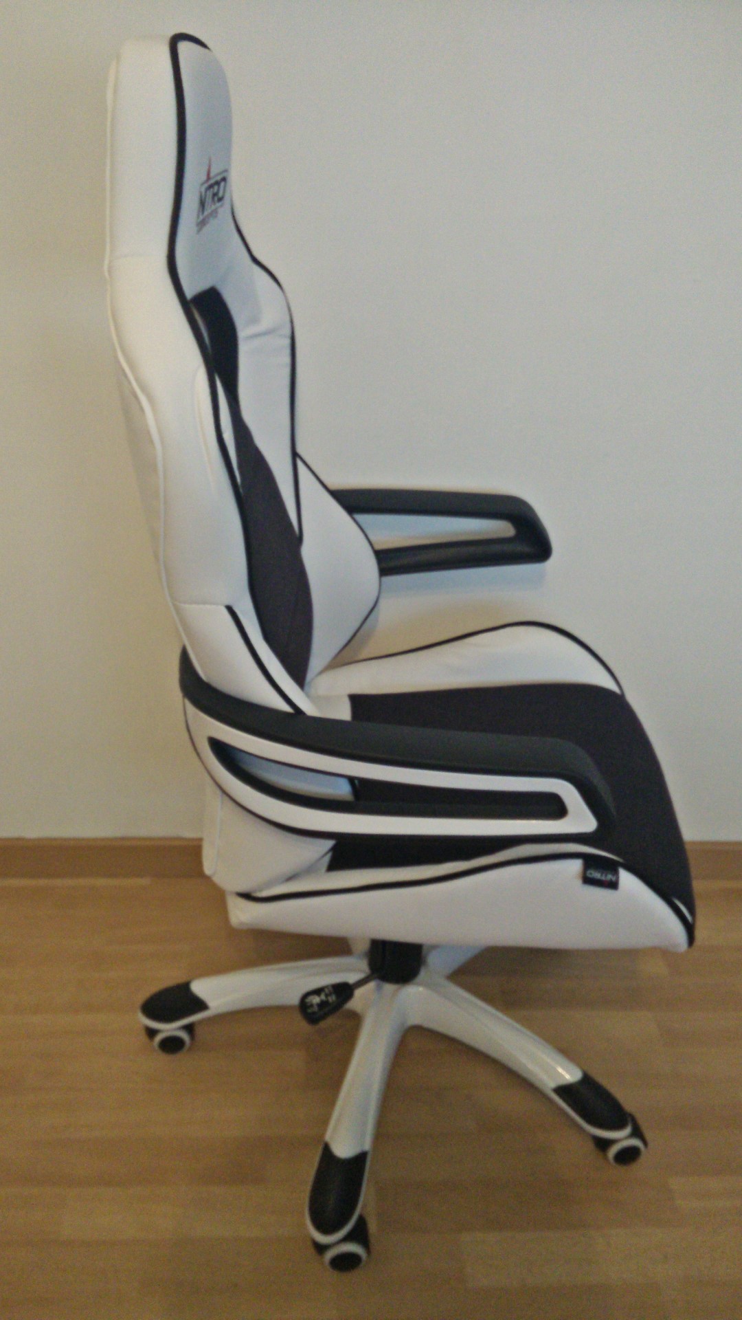 Opnieuw moet gezegd worden dat de bouwkwaliteit echt wel uitstekend is en daarmee ligt ook de prijs-kwaliteitverhouding erg hoog. De stoel is uiteraard prima in de hoogte verstelbaar en het aanpassen gebeurt ook erg soepel. De rugleuning is eveneens erg stevig en zorgt voor een goede steun. De armleuningen zijn niet bekleed met leder en zijn gemaakt van hard plastic. Het binnenste van deze armleuningen is voorzien van de kleur naar keuze in glossy plastic, en het geeft de stoel een prima uitstraling mee. De armleuningen zijn niet verstelbaar qua diepte, maar vanzelfsprekend kan je er prima en comfortabel een arm of elleboog op laten rusten. Door de bevestiging van de armleuning achterop de stoel te zetten krijg je een soort van zwevend effect en is het ook netjes uit het zicht verwijderd.