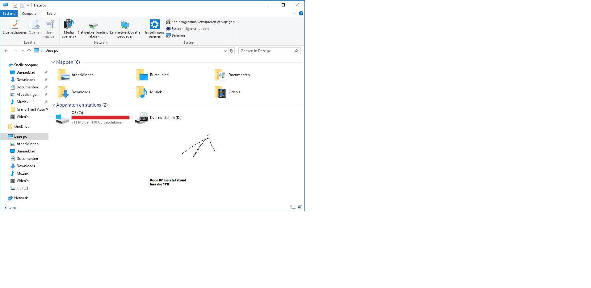 Hallo ik heb met mijn pc systeemherstel gedaan en daarna is m'n harde schijf van mij pc weg het was 1TB