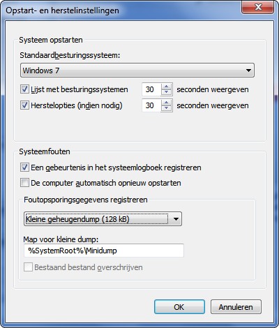 Open de tab geavanceerd en klik bij opstart en herstelinstellingen op de knop instellingen.