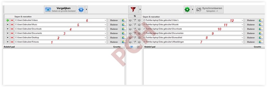 Stel nu de bron- en doelmappen in zoals in deze afbeelding is weergegeven. De volgorde van uitvoeren heb ik genummerd. Voor meer info kun je altijd nog terecht in de handleiding pagina 8 vanaf hoofdstuk "Laten we beginnen met de instelling daarvan".951512207_FreeFileSync10.10001.thumb.JPG.0280b76770349a190af016cbeac2e096.JPG
