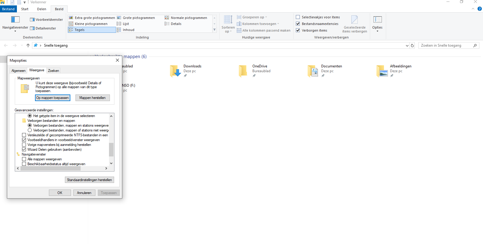 • Selecteer het tabblad Weergave en selecteer onder Geavanceerde instellingen de optie Verborgen bestanden, mappen en stations weergeven en OK.