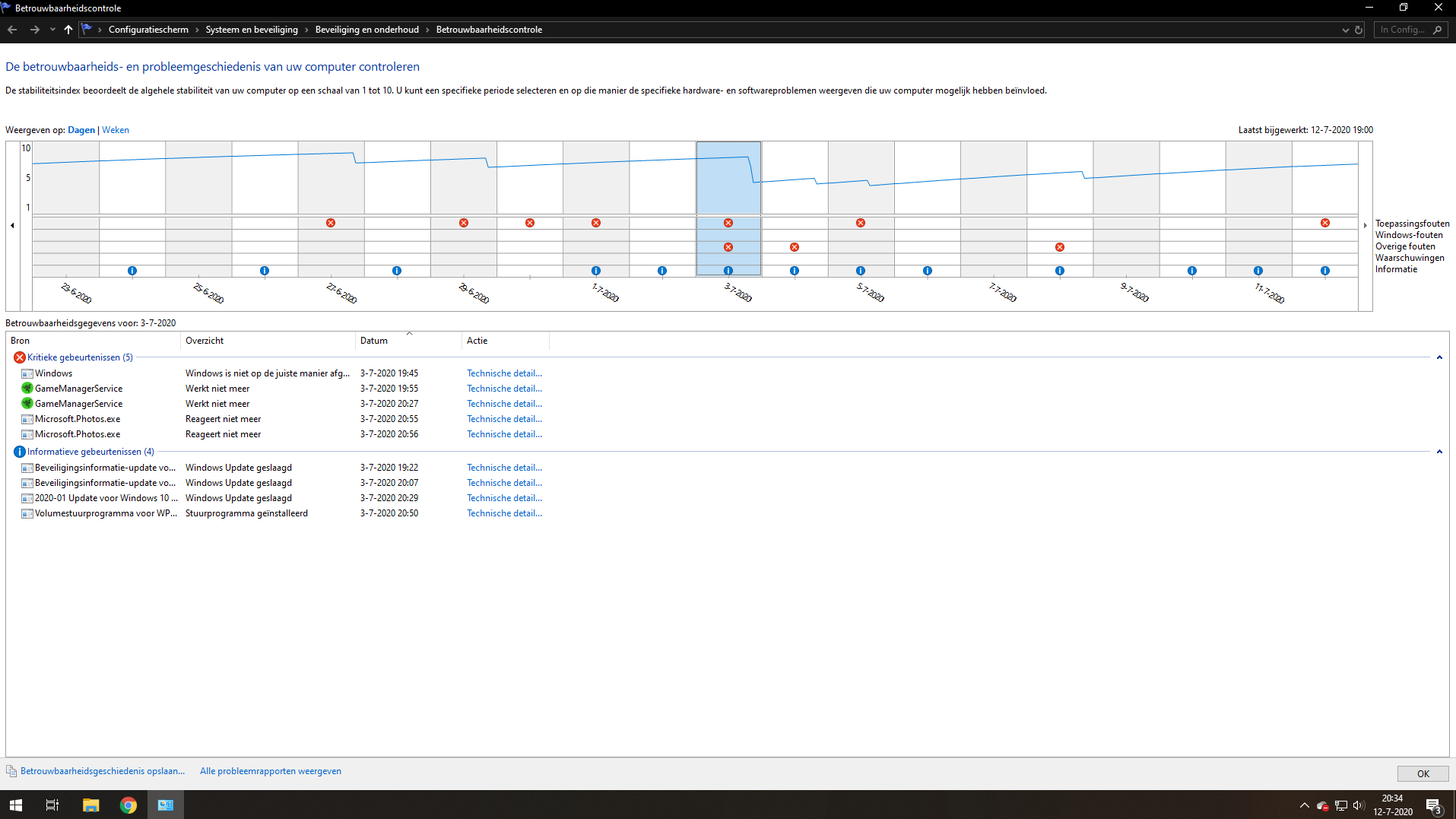 Nu zie je dus de kritieke gebeurtenissen van één bepaalde datum. Als je nu bij de andere rode vermeldingen gaat kijken welke vermeldingen vind je dan steeds terug of komen regelmatig voor bij de andere data? Zo vinden we misschien een programma wat verantwoordelijk is voor het vaak vastlopen van je systeem.