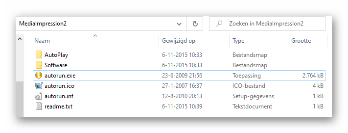 Wanneer je het rar bestand hebt uitgepakt, dan zie je in de lijst met mappen en bestanden het bestand autorun.exe staan: