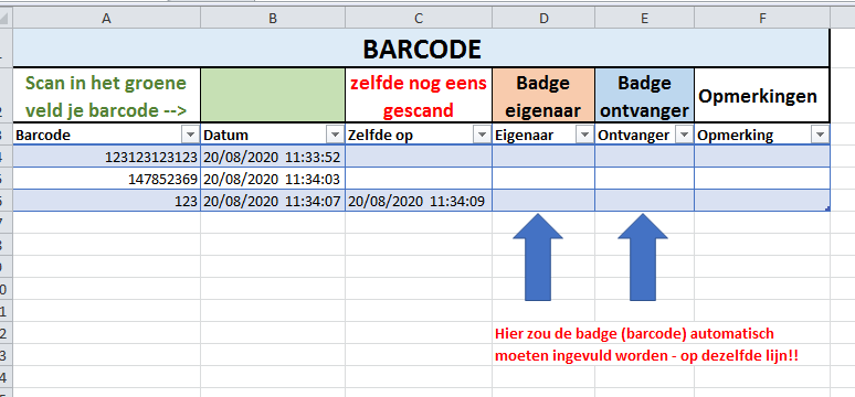 Enkel zou ik nog graag hebben dat, wanneer je de barcode hebt ingescand (B2 - groen) en op tab of enter klikt, je automatisch naar het volgende veld gaat (D2 - oranje), dan naar het laatste gekleurde veld (E2 - blauw) en alles automatisch laten invullen op de 1st volgende vrije rij  om dan finaal terug te keren naar de lege basis B2.