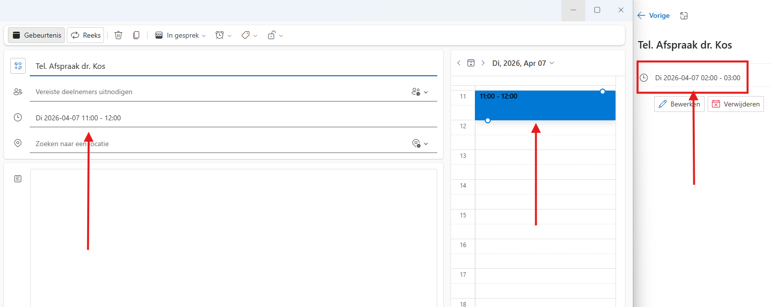 Sinds ik ben overgegaan op de nieuwste versie van Outlook (Het Nieuwe Outlook) zie ik dat de tijd die ik heb ingevoerd waarop een afspraak moet plaatsvinden (rechtsboven) niet klopt. Ik heb ingevoerd: 11.00-12.00 uur, maar rechts in beeld staat 02.00-03.00 uur. Zie ook de schermafdruk. Wat is hier aan de hand? Kan iemand mij dat uitleggen?