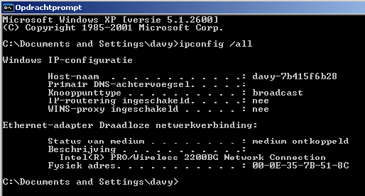 Ik zie geen IP adres maar ik zie wel uw mac adres van uw draadloos netwerkkaart.